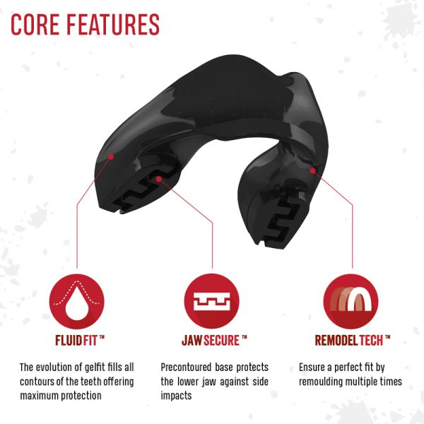 Realizat din două straturi pentru amortizare optimă, protectorul utilizează tehnologia Fluid-Fit, care permite modelarea perfectă după forma dinților, pentru o fixare sigură în timpul antrenamentelor. Tehnologia Jaw-Secure asigură protecție și pentru dinții inferiori, chiar dacă este un protector simplu.