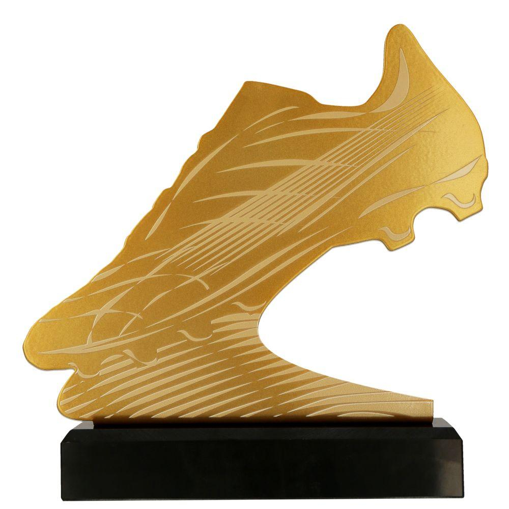Forma de gheată de fotbal și finisajul auriu evidențiază spiritul competițional și prestigiul premiului.
